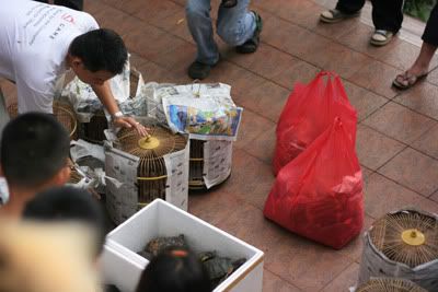 那天,找了小鱼到Tmn Tun 外拍,那天的天气不是很好。。下起了小雨来,我们到了Tmn Tun,停了车,就看到一班人在楼梯那边似乎围着一东西在祈祷。我跟小鱼走近一看,原来是好几个鸟笼,还有用保丽龙箱装着的陆龟。。